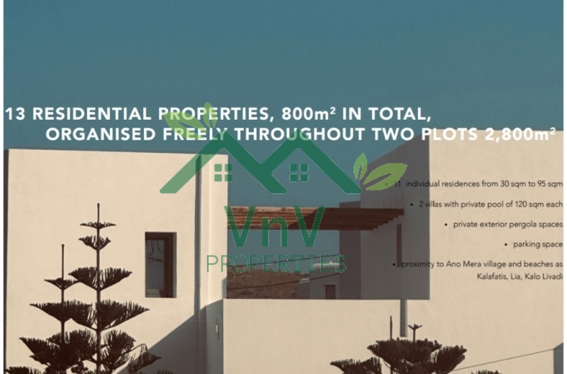 Κωδικός ακινήτου: S4 – Μύκονος Άνω Μερά ΠΩΛΕΙΤΑΙ νεόδμητο επιπλωμένος συγκρότημα κατοικιών ισόγειο συνολικής επιφάνειας 380 τ.μ. σε οικόπεδο 2800 τ.μ. . Αποτελείται από . Είναι κατασκευασμένος το 2025 με ενεργειακή κλάση Α+ και ανακαινίστηκε το 2025. Διαθέτει θέα σε ανοιχτό ορίζοντα, πατώματα από πλακάκι, πόρτα ασφαλείας, πάρκινγκ, πισίνα, A/C, προεγκατάσταση Α/C, συναγερμό, προεγκατάσταση συναγερμού, ηλεκτρικές συσκευές, σίτες, ηλιακό θερμοσίφωνα, κάμερες, ανοιχτωσιά απόσταση από θάλασσα 1000 μέτρα απόσταση από πόλη 200 μέτρα απόσταση από χωριό 200 μέτρα απόσταση από αεροδρόμιο 2000 μέτρα – Τιμή: 4.500.000 € Πωλείται μοναδικό συγκρότημα κατοικιών που περιλαμβάνει 11 ανεξάρτητες κατοικίες, με εμβαδόν από 30 τ.μ. έως 95 τ.μ., καθώς και 2 βίλες των 120 τ.μ., καθεμία με ιδιωτική πισίνα. Όλες οι κατοικίες διαθέτουν ιδιωτικούς εξωτερικούς χώρους με πέργκολες, μπαταρίες εντοιχισμού ενώ παρέχεται και χώρος στάθμευσης. Επίσης ξύλινα παράθυρα με σίτες, air condition, πόρτες ασφαλείας, πλακάκι δαπέδου και ηλιακό θερμοσίφωνα. Επιπλέον, περιλαμβάνουν εντοιχισμένες μπαταρίες και εντοιχισμένες κουζίνες που προσφέρουν λειτουργικότητα και αισθητική. Τα διαμερίσματα είναι φωτεινά και επιπλωμένα, προσεγμένα με γούστο και έτοιμα για άμεση κατοικία. Πρόκειται για μια ιδανική επιλογή για όσους αναζητούν άνεση, ασφάλεια και πρακτικότητα σε ένα ευχάριστο περιβάλλον. Το ακίνητο βρίσκεται σε προνομιακή τοποθεσία, κοντά στο παραδοσιακό χωριό Άνω Μερά και σε δημοφιλείς παραλίες όπως ο Καλαφάτης, η Λια και το Καλό Λιβάδι, προσφέροντας έναν ιδανικό συνδυασμό ηρεμίας και πρόσβασης στις ομορφιές της Μυκόνου. Διατίθεται προς πώληση ως ενιαίο σύνολο (Α & Β συγκρότημα) στην τιμή των 4.500.000 €, ή μεμονωμένα: